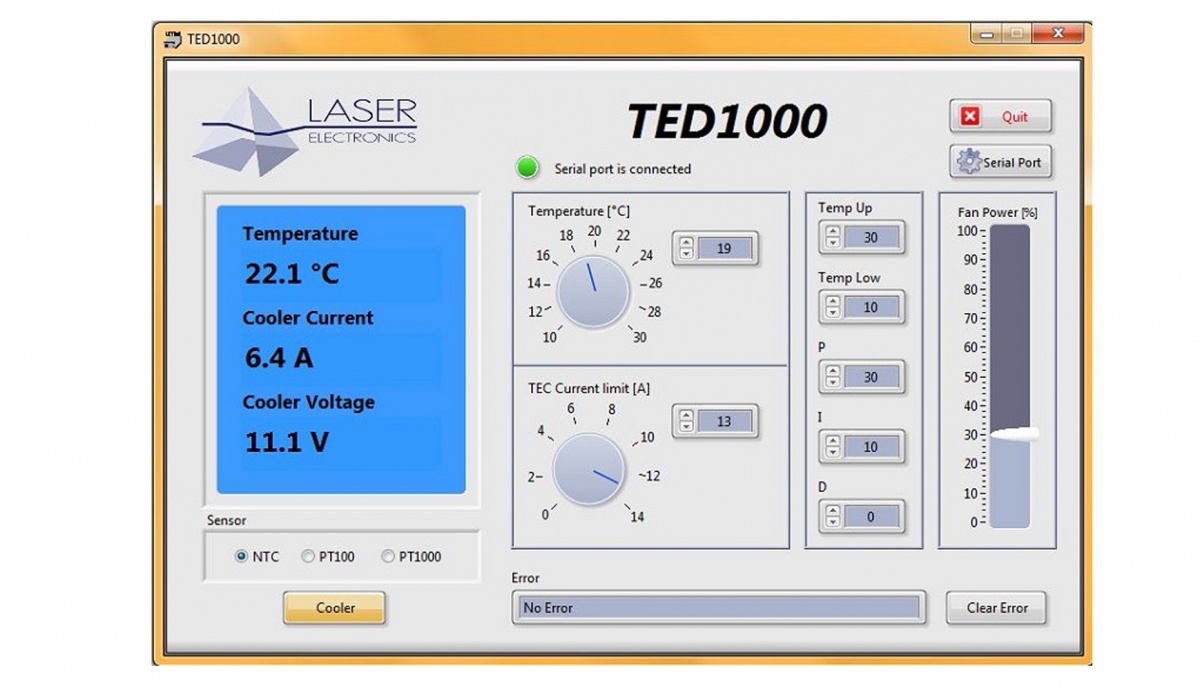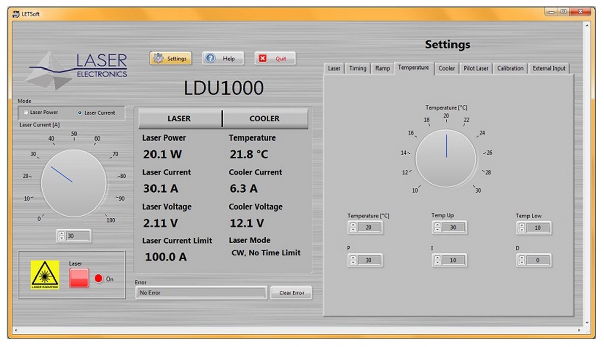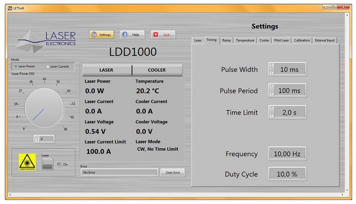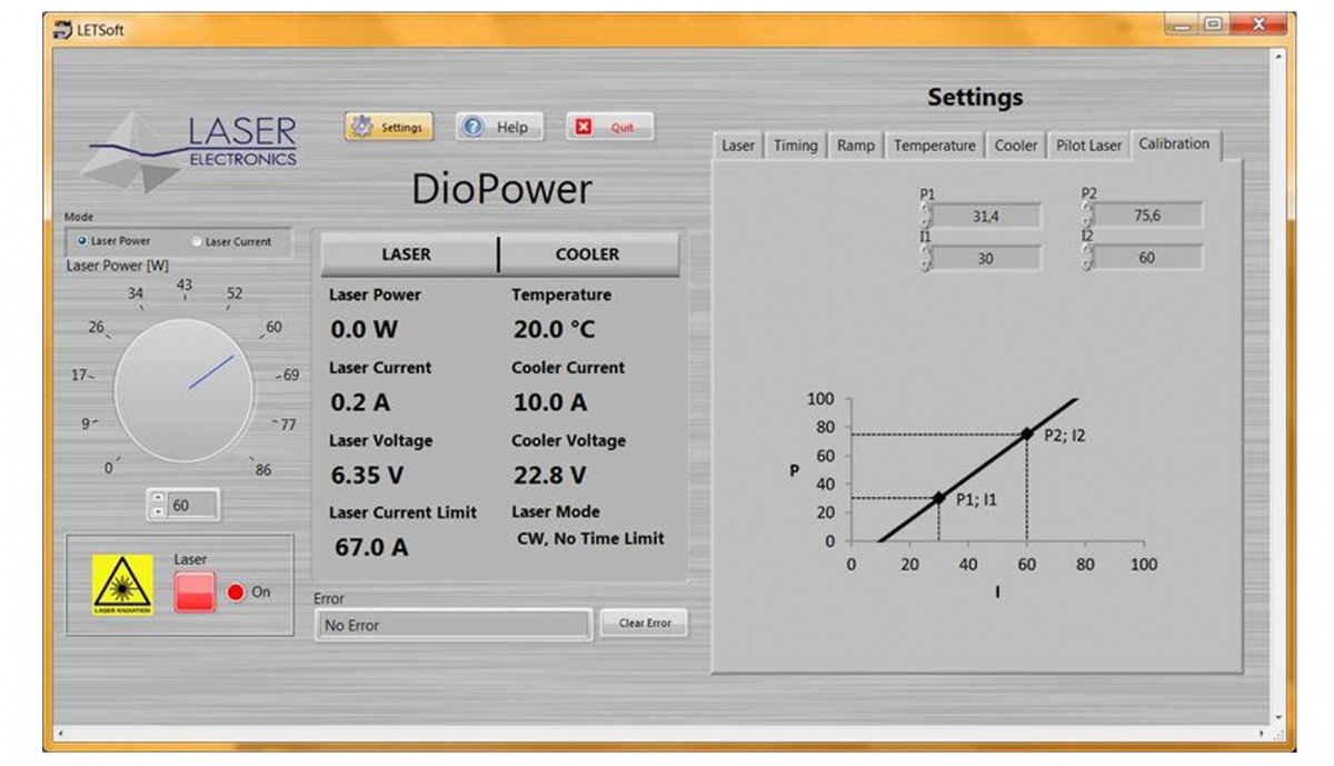 The DioPower conveniently offers an integrated diode laser system. All necessary components such as the laser diode, the laser diode driver, the TEC-driver and the laser diode cooler are included. The customer can choose a suitable laser diode regarding his requirement.