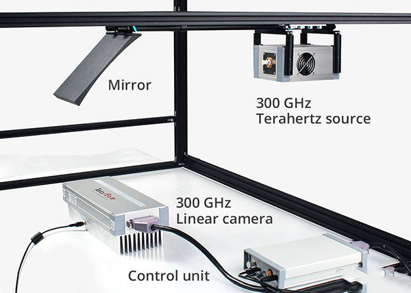 The Terahertz Imaging Scanner system consists of two parts: a linear terahertz imaging camera and a 100 GHz Terahertz generator. Both parts are optimized and synchronized to each other. THz radiation power is properly delivered from the generator onto the camera sensor. The camera pixel size determines an image resolution of 1.5 mm, which exceeds the requirements of most industrial applications.